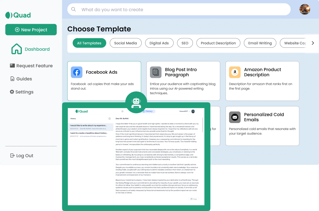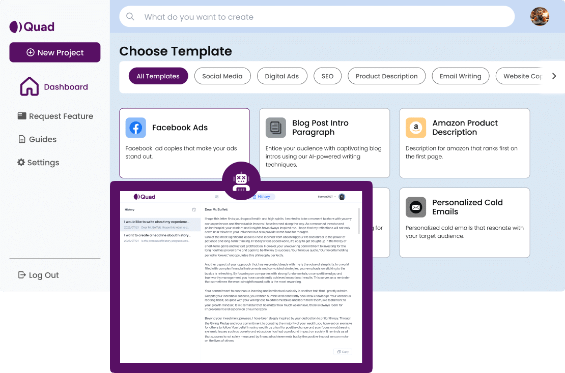 At quadmob we're passionate about harnessing the power of artificial intelligence to transform the way you create content. With our cutting-edge technology and intuitive platform, we're here to revolutionise your writing experience.